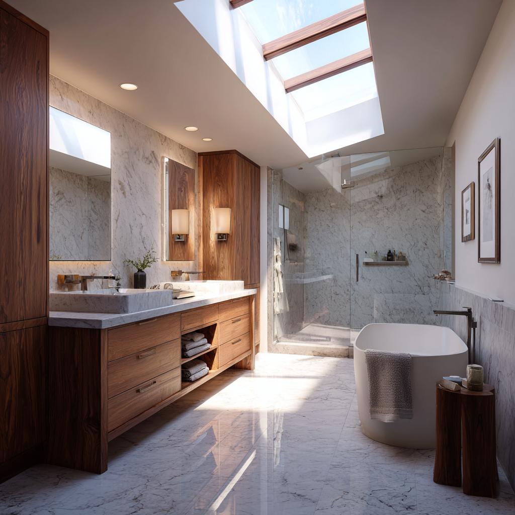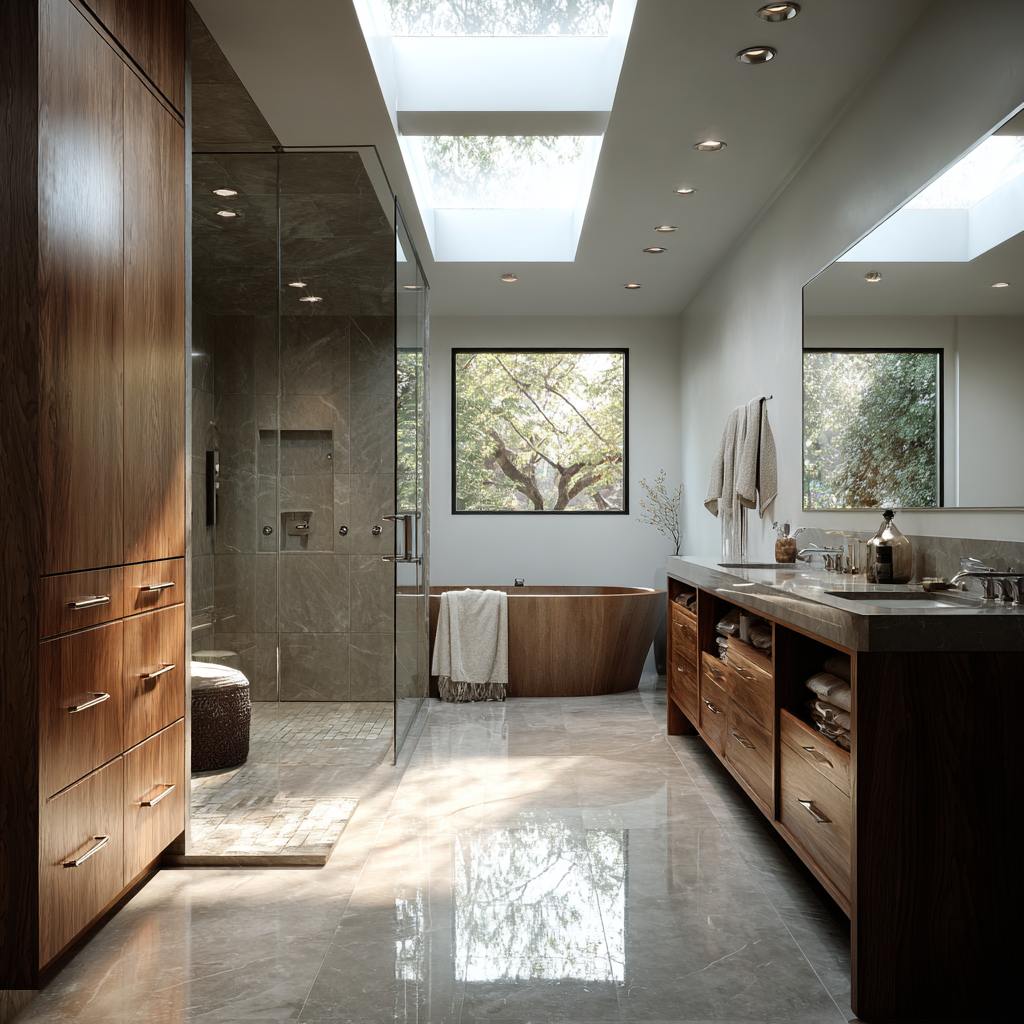 Owners of a 1990s Menlo Park home needed serenity after marathon workdays. We enlarged the shower into a zero-threshold steam enclosure, added a freestanding tub beneath skylights, and floated a walnut vanity with back-lit mirrors. Heated floors, honed-marble walls, and discreet